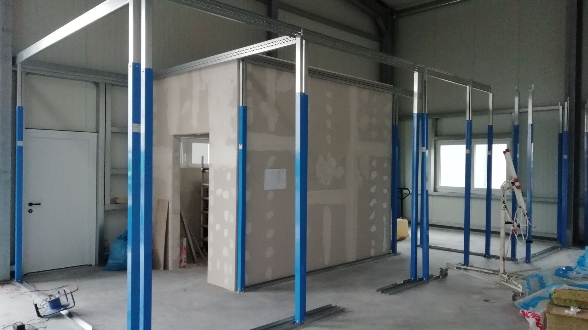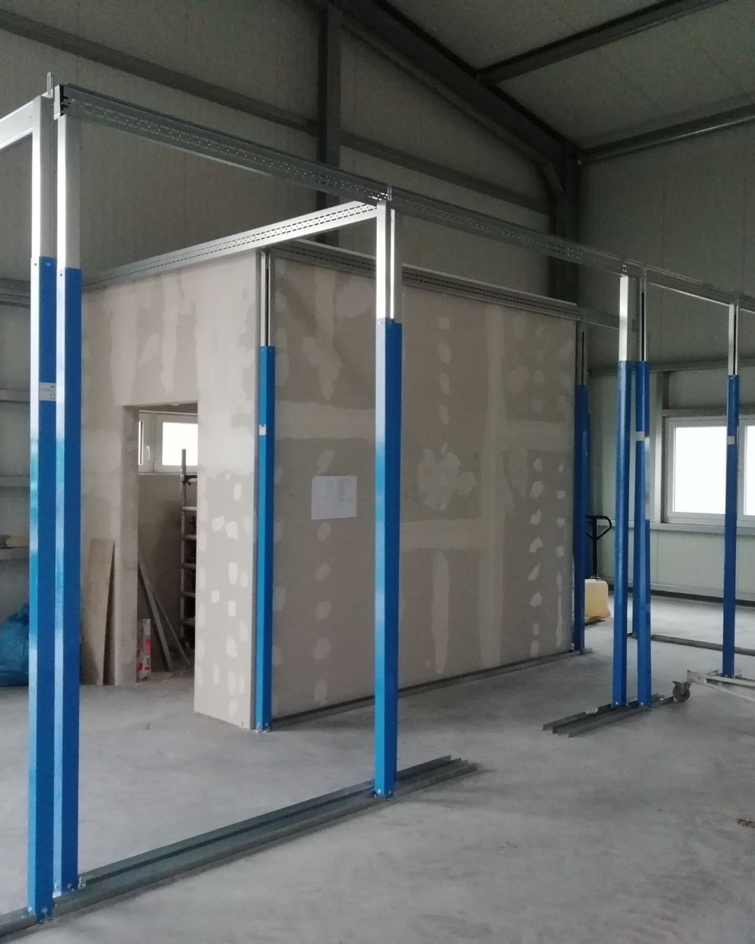 - Errichtung stabiler Gipskartonwände zur klaren Strukturierung von Büro-, Besprechungs- und Lagerbereichen