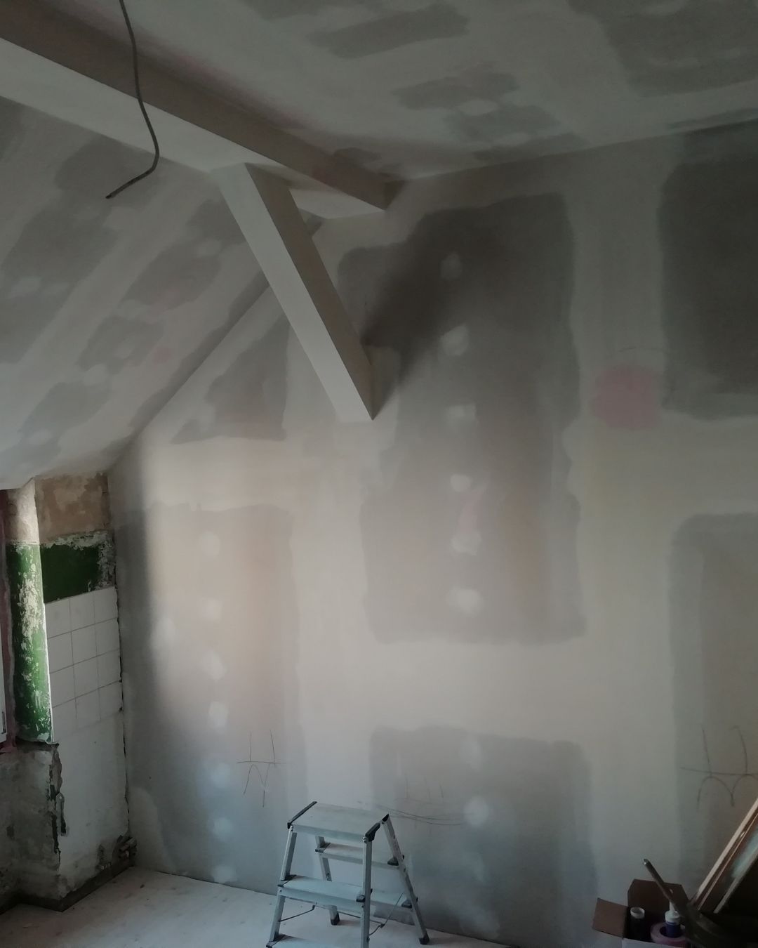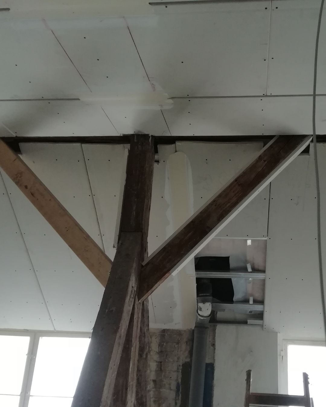 • Die bestehenden tragenden Holzbalken wurden teilweise verkleidet und sauber in die neue Trockenbaukonstruktion integriert, ohne die statische Funktion zu beeinträchtigen. Die Arbeiten erfolgten millimetergenau aufgrund der komplexen Geometrien.